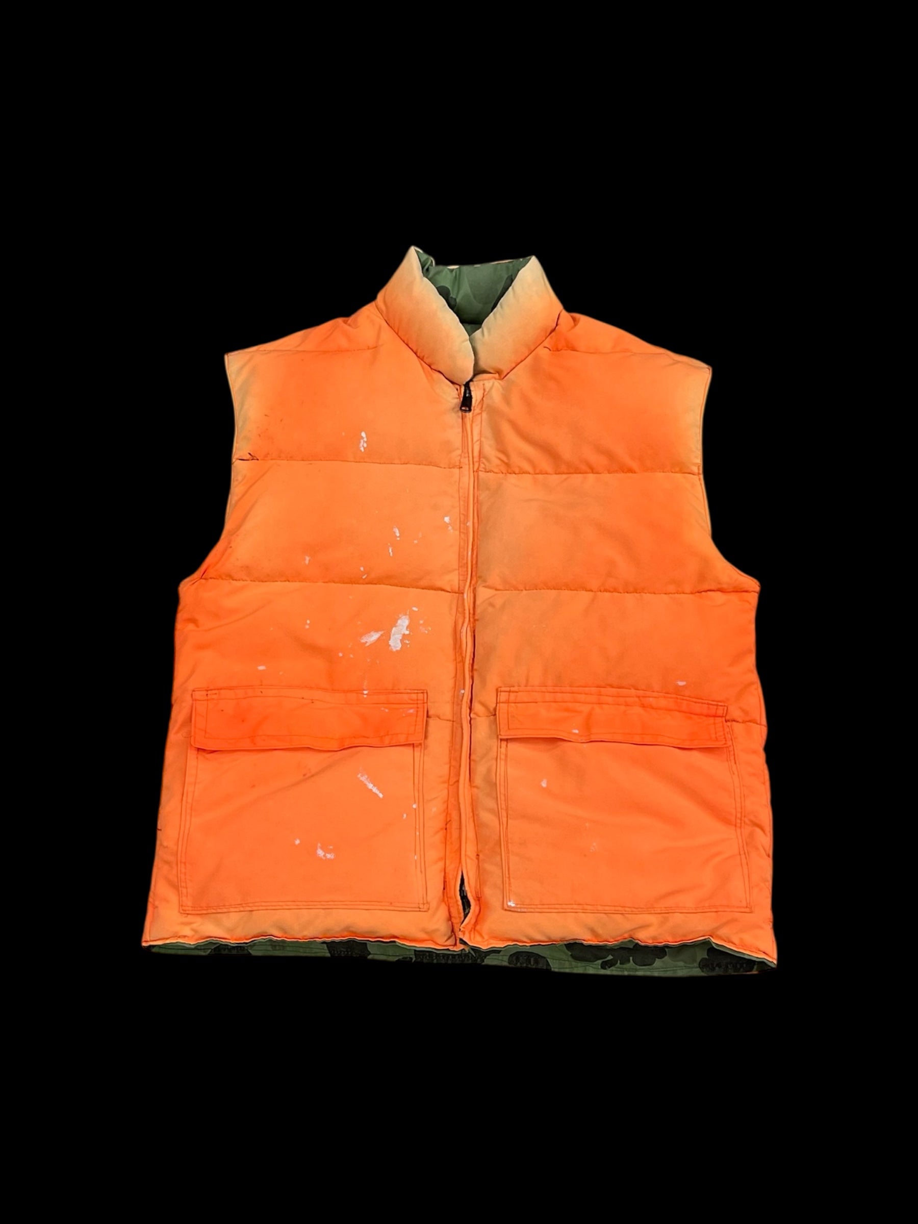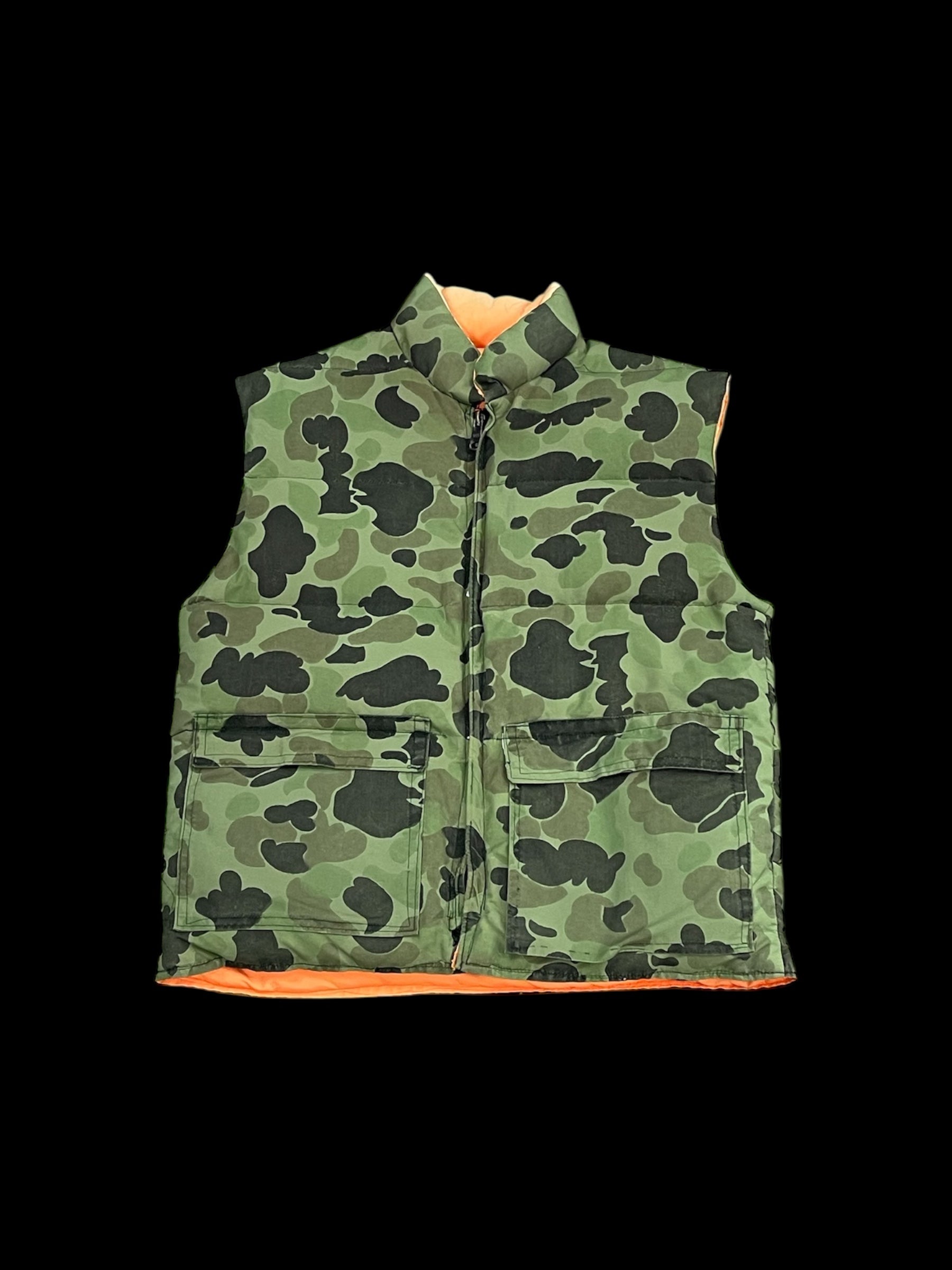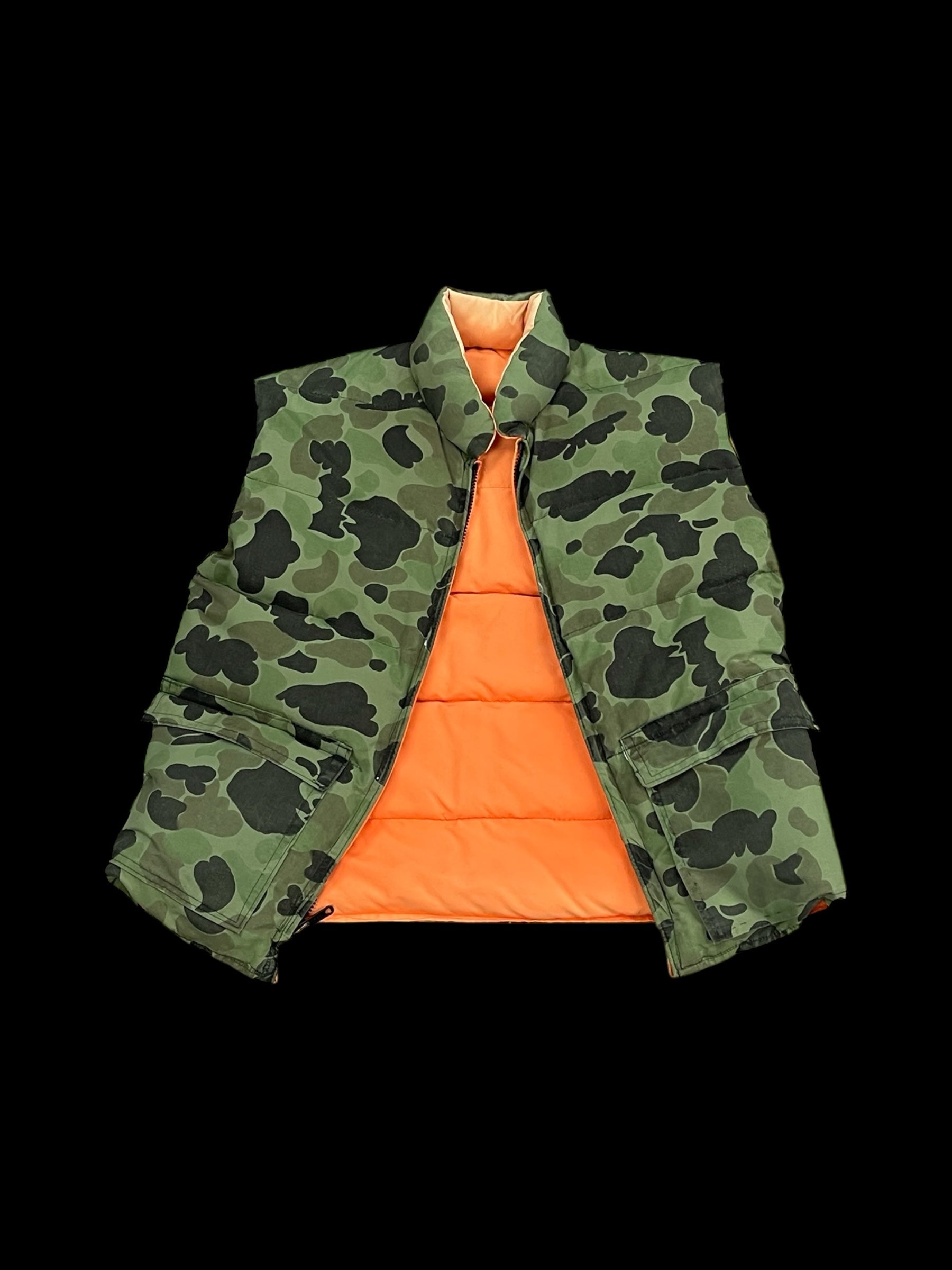 made in USA/vintage/woodland camo puffer/zip closure/flap pocket utility storage/reversible/signs of wear*